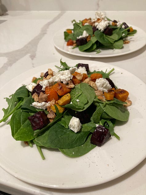 I’ve been OBSESSED with this salad. Like, eating it for breakfast. Arugula, spinach, roasted beets/butternut squash, goat cheese, candied walnuts, balsamic vinegar +EVOO